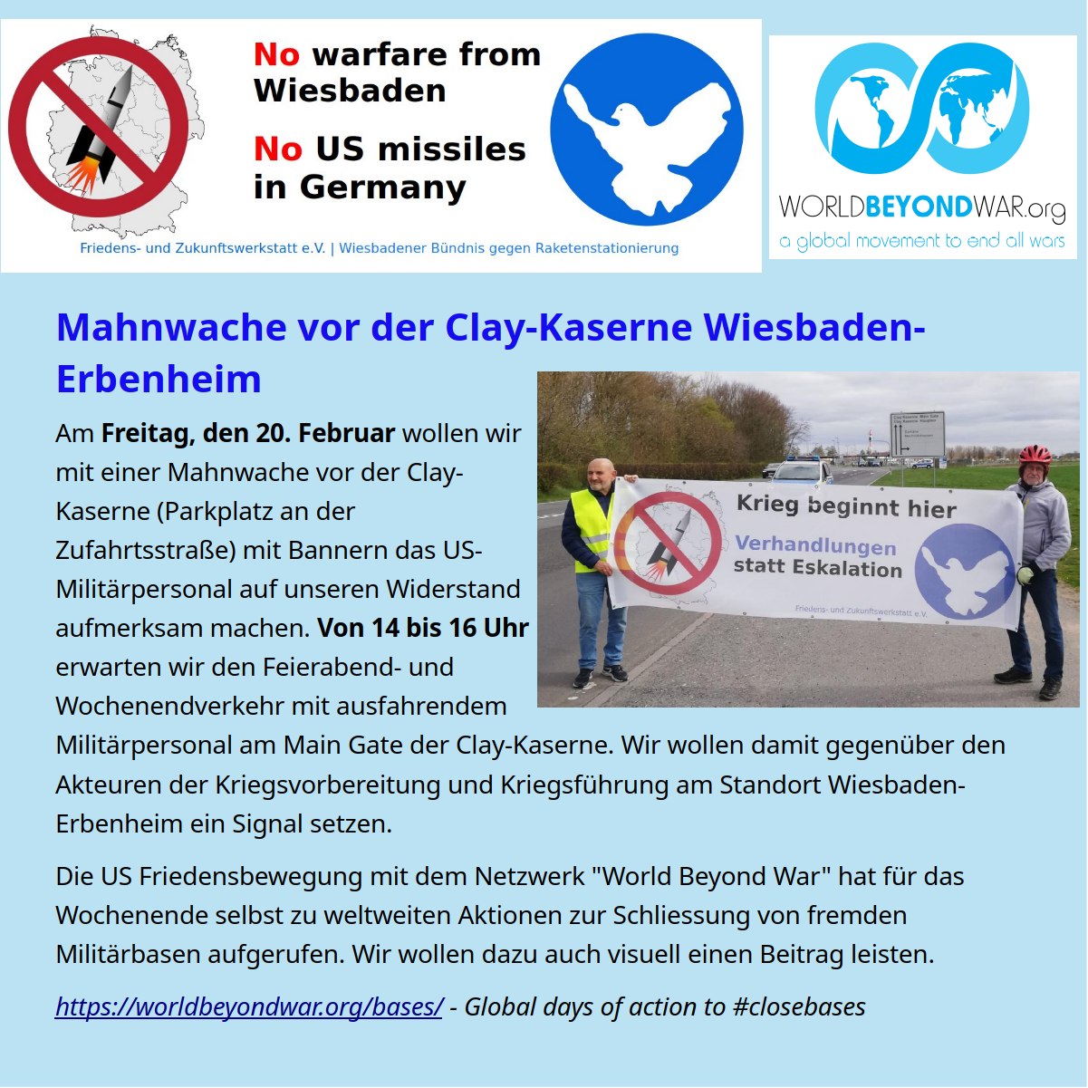 Am Freitag, den 20. Februar wollen wir mit einer Mahnwache vor der Clay-Kaserne (Parkplatz an der Zufahrtsstraße) mit Bannern das US-Militärpersonal auf unseren Widerstand aufmerksam machen. Von 14 bis 16 Uhr erwarten wir den Feierabend- und Wochenendverkehr mit ausfahrendem Militärpersonal am Main Gate der Clay-Kaserne. Wir wollen damit gegenüber den Akteuren der Kriegsvorbereitung und Kriegsführung am Standort Wiesbaden-Erbenheim ein Signal setzen.