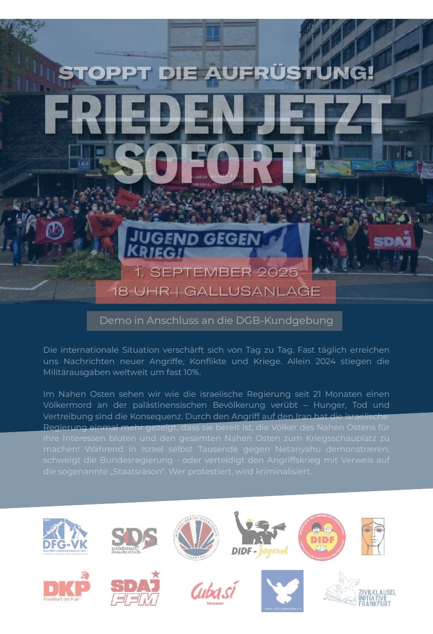 Nachfolgend der Aufruf, wie er u.a. von DIDF und DIDF-Jugend erstellt und für die vorgesehene Jugenddemo in Verbindung mit der DGB-Kundgebung in der Gallusanlage verbreitet wird. Der Aufruf wird auch von der Friedens- und Zukunftswerkstatt unterstützt.