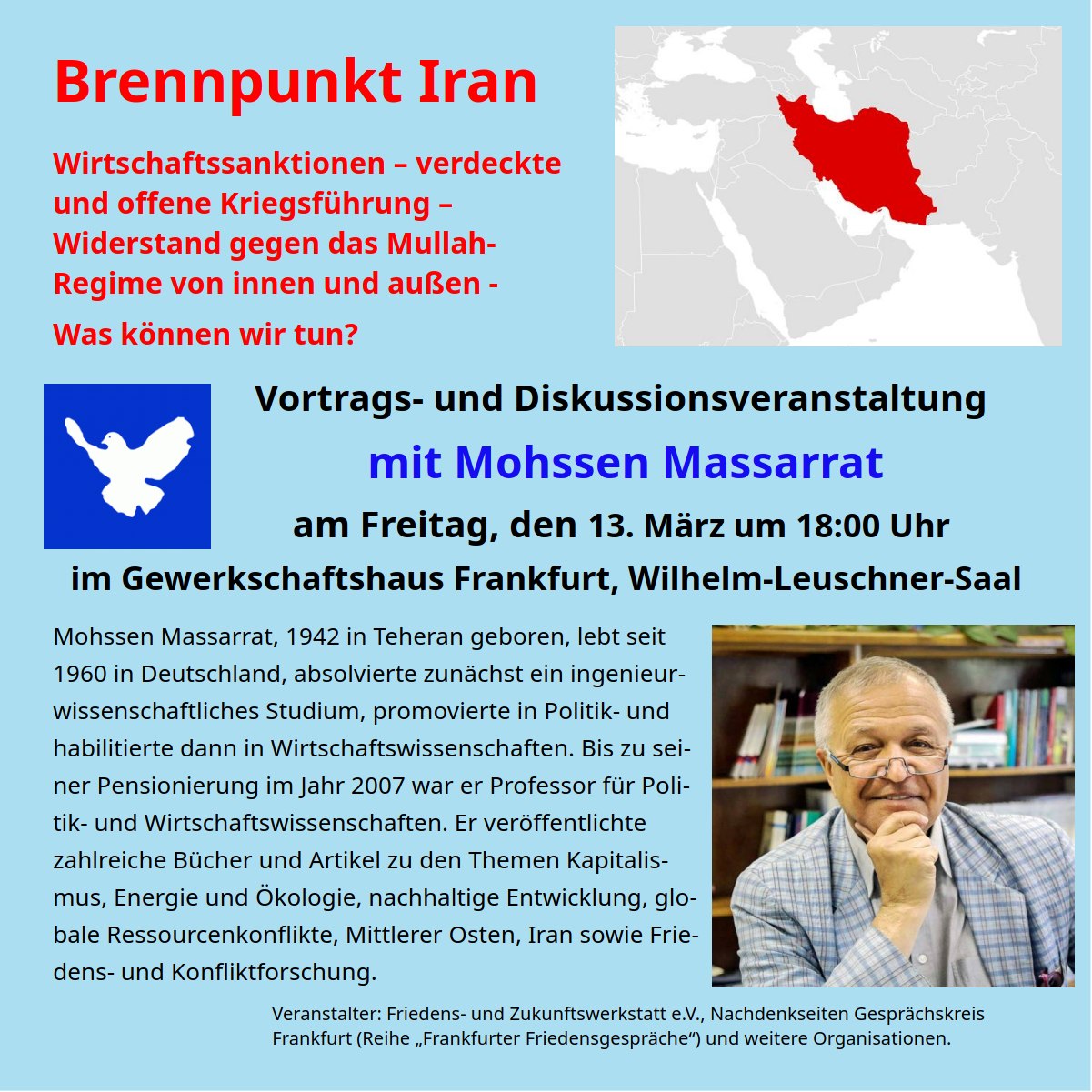 Veranstalter: Friedens- und Zukunftswerkstatt e.V., Nachdenkseiten Gesprächskreis Frankfurt (Reihe „Frankfurter Friedensgespräche“) und weitere Organisationen.